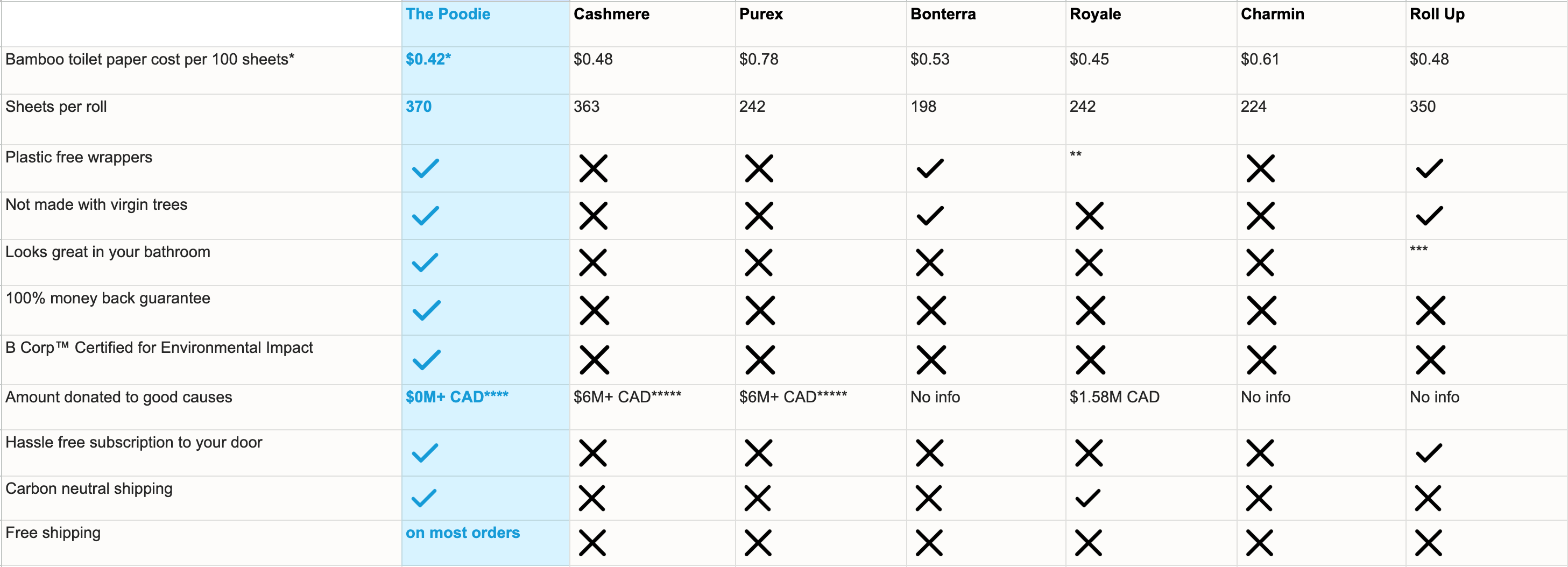 *Bamboo TP 48 pack = $0.42 per 100 sheets.**Royale bathroom tissue is available in both plastic and plastic-free packaging. ***Roll Up offers both wrapped and bare rolls. ****The poodie does not yet have an official donation amount because the company began operating on January 1, 2026. ***** Cashmere, Purex and Bonterra brands are owned by Kruger Products. Kruger Products has publicly listed financial donations of $5M CAD toward breast cancer awareness and $1M CAD toward kids hockey accessibility.